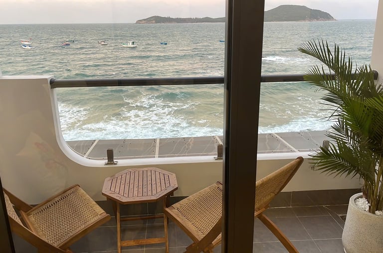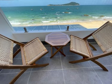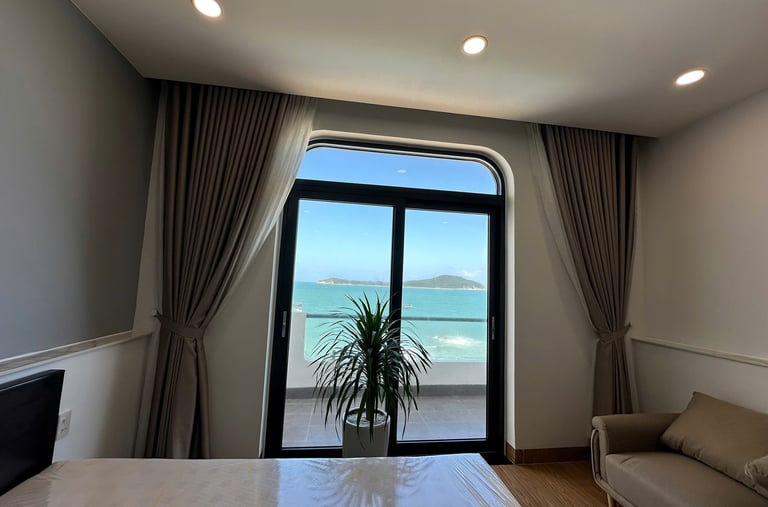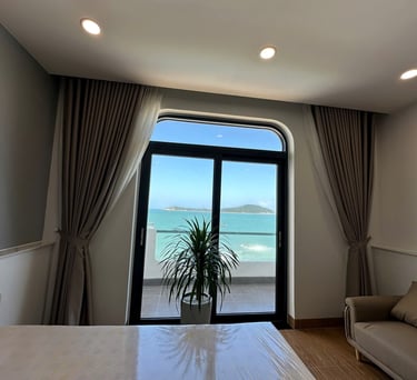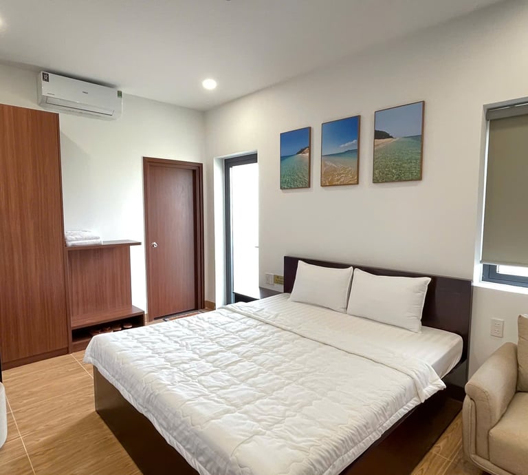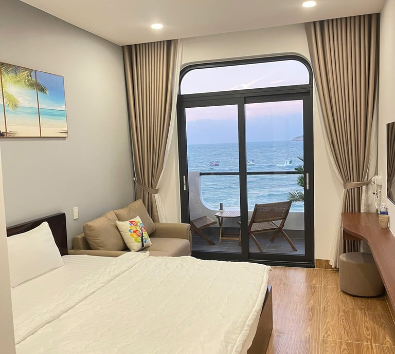Với diện tích 20.5 m2, có ban công hướng biển, 1 giường 1m6 với sức chứa 2 người lớn + 1 trẻ em.